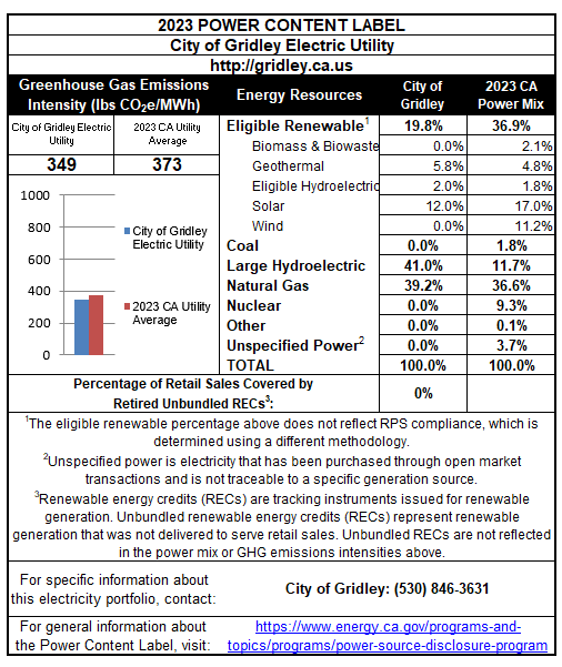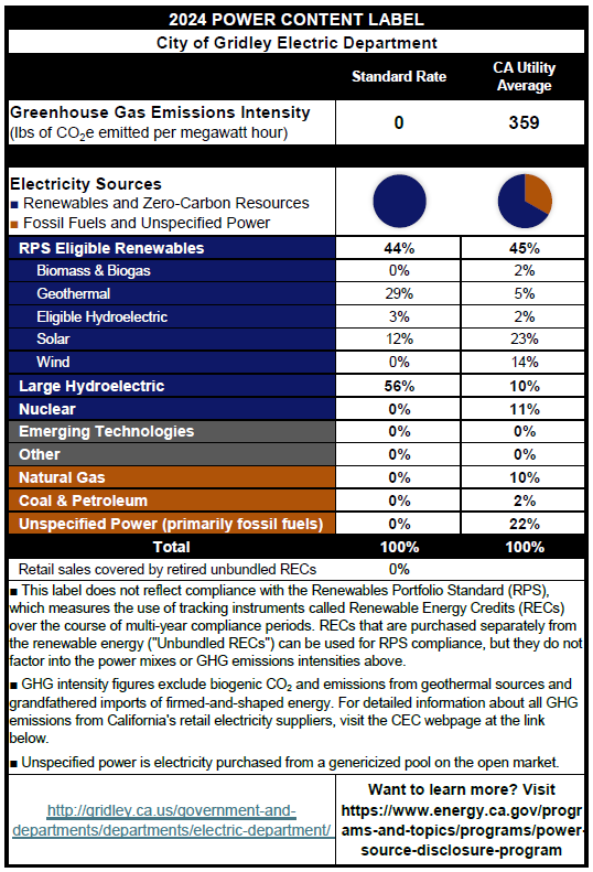 As one of the oldest California municipal power agencies, established in 1910, the City of Gridley Electric Utility oversees the delivery of wholesale power, maintains and operates the local electric distribution system, is involved in engineering and advance planning for improvements, replacement and expansion of distribution system, and maintenance and operation of the City's street lighting system.